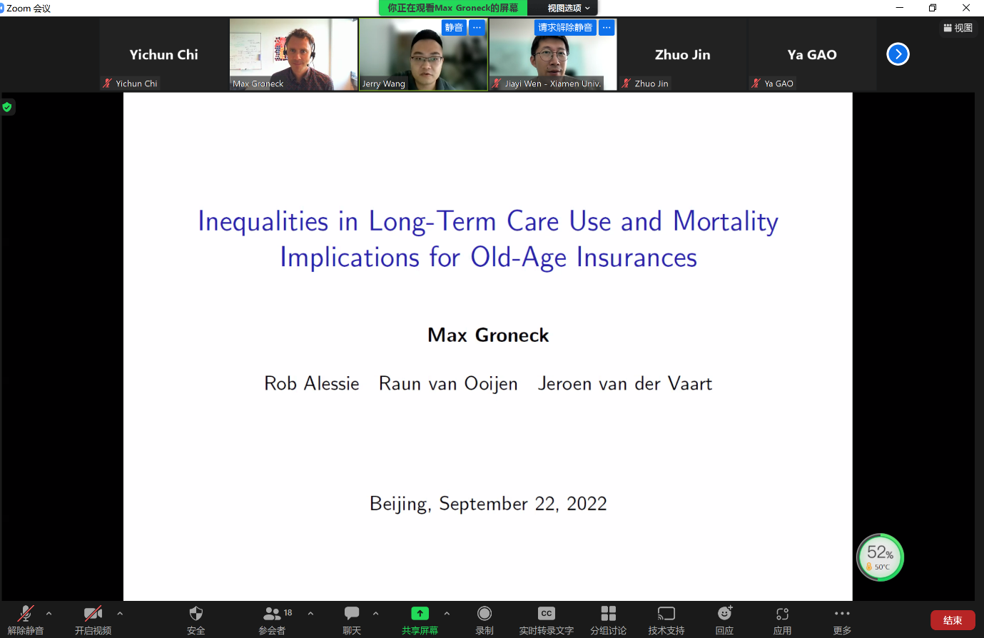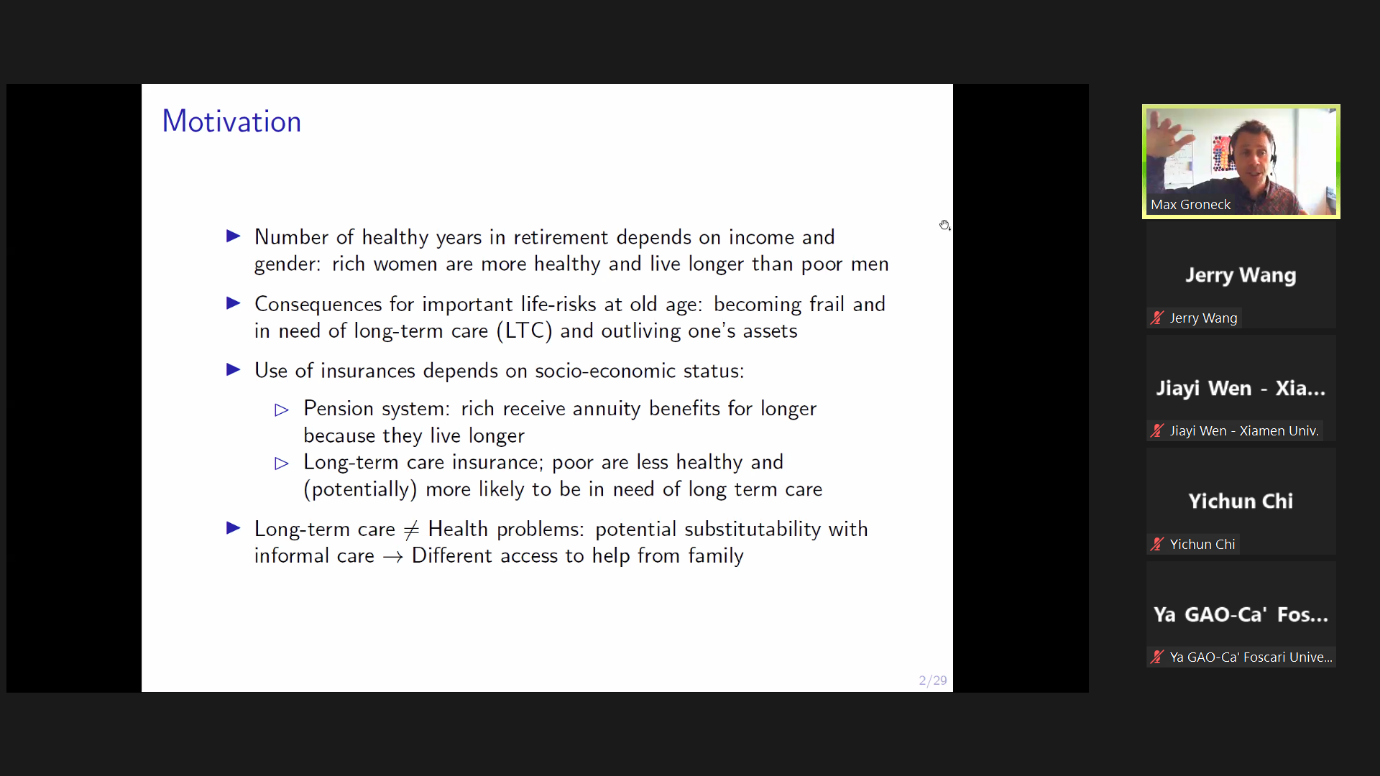 Max Groneck报告的题目为“Inequalities in long-term care use and mortality implications for old-age insurances”。Max首先介绍了他和合作者利用荷兰详尽的长护险利用数据分析得出的重要经验事实,然后基于这些事实,构建了一个简约的模型讨论了长护险和养老金合并情况下,如果以控制逆向选择最低水平时,保费回报水平变化的情况,并针对不同情况讨论了可能的政策建议。