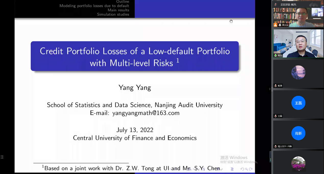 杨洋教授报告题目为《Credit Portfolio Losses of a Low-default Portfolio withMulti-level Risks》。他探讨一个低违约投资组合的静态结构模型,其中债务人会面临一个多层次风险,分别为共同冲击风险、系统性行业风险和特质风险。在异质风险(1)相互独立且尾分布正则变化或(2)具有多元正则变化相依结构的假设下,得到了信用组合违约损失尾部概率的两个渐进收敛性质。