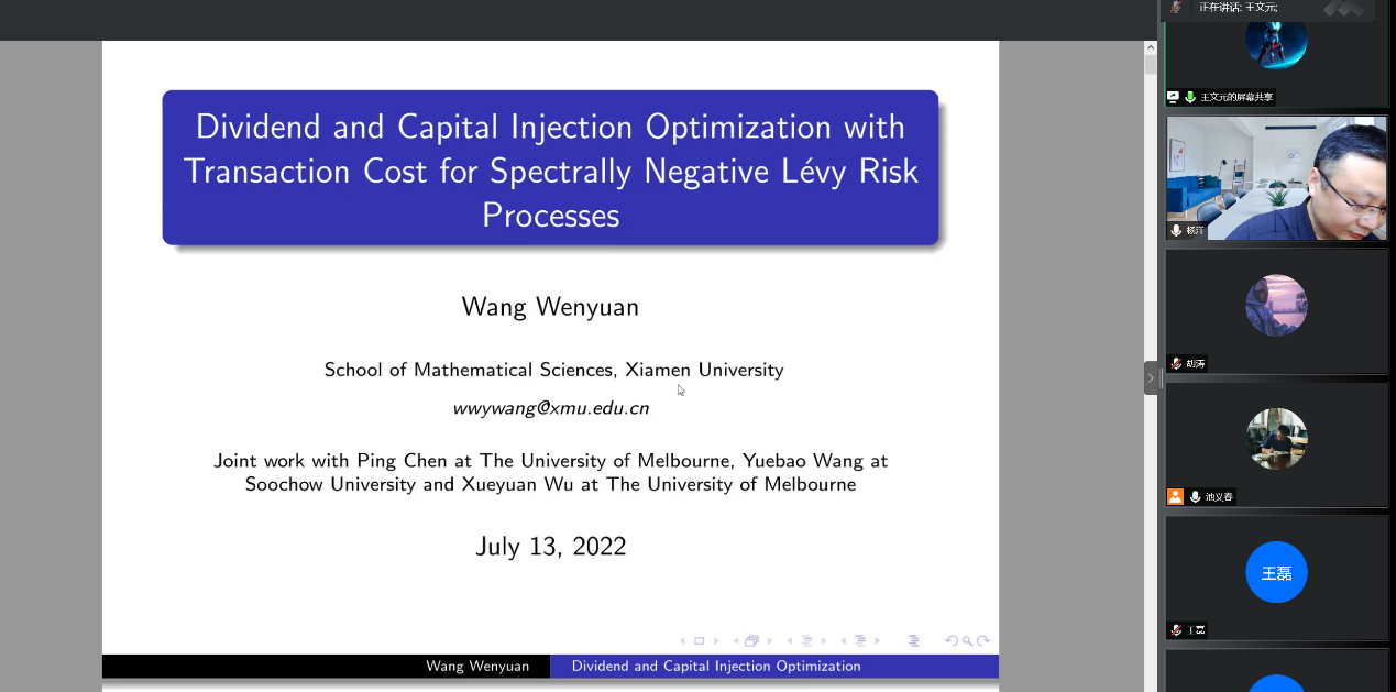 王文元教授报告题目为《Dividend and Capital Injection Optimization with Transaction Cost for Lévy Risk Processes》。他主要探讨在谱负Levy盈余过程下保险公司的最优脉冲分红和注资(IDCI)策略,其中优化目标为最大化预期的累计贴现分红扣除注资的累计贴现成本。他得到了最优的IDCI策略及其价值函数。他还举了两个数值例子来说明最优策略的性质。