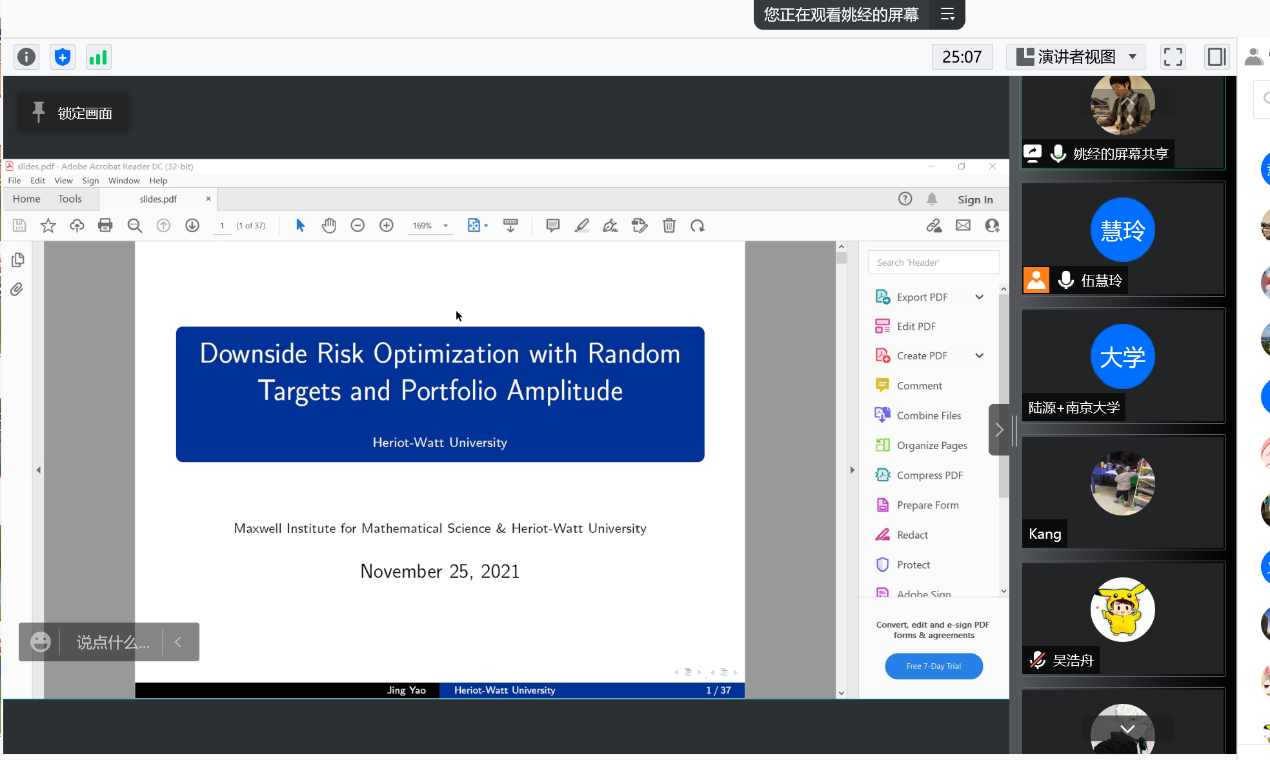 2021年11月25日下午2-4点,来自赫瑞瓦特大学统计精算系的姚经教授和广东外语外贸大学金融学院的姚海祥教授为伟德官网师生详细介绍了带有下方风险控制的最优投资组合选择问题。