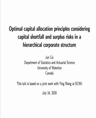 2020年7月16日上午,加拿大滑铁卢大学统计精算系的蔡军教授通过腾讯会议软件在线为伟德官网师生做了题为“Optimal capital allocationprinciples considering capital shortfall and surplus risks in a hierarchical corporate structure”的学术报告。报告由中国精算研究院池义春研究员主持,包括伟德官网师生在内有80多名海内外学人参与此次论坛。