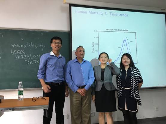 2017年9月27日下午14:00-18:00于沙河校区主教208教室,中国精算研究院邀请到了斯坦福大学人口研究院Virginia Morrison终身教授、院长,加州大学伯克利分校经济与老龄化中心研究员Shripad Tuljapurkar 教授为大家带来了短期课程“Forecastingmortality”,该次课程主要包括以下部分a) Challenges & priormethods, b) what is SVD, c) Lee-Carter methods, e) Alternative approaches andpricing,伟德官网周明副院长、伍慧玲副研究员、韦晓副研究员以及部分博士生、研究生参加了本次的讲座。