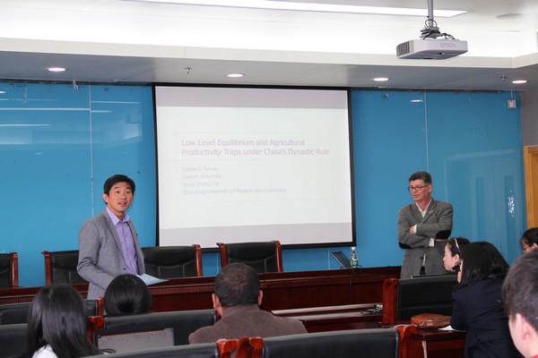 报告中,Turvey教授结合经验数据,对中国农业历史上(至1912年)长时间出现的低水平均衡做出了分析。首先引入了在有限土地资源前提下的产量均衡分析框架和马尔萨斯提出的在饥荒和自然灾害下的人口锐减模型(Malthusian purge)作为理论框架,用四象限图分析了农业生产在不同劳动力,技术和土地水平下的动态均衡过程;然后引入降雨量和历史各时期中国统治者对于农业生产的“态度”这两个看似不相关的变量对农业生产水平进行建模,并通过指数增长模型和长期弹性模型对变量之间的影响效果做出了阐述。值得强调的是,Tuevey教授创造性地引入了“统治者对农业生产的态度”这一相对主观的因素作为解释变量,并利用打分法加以量化,最后引入模型分析,对我国历史上长期出现的农业生产低水平均衡现象提出了一种全新的可能解释,非常具有启发性,使参与讲座的老师和同学们大获裨益。