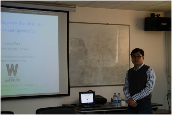 2016年3月31日上午10点整,中国精算研究院精算论坛讲座第七十八期准时开始。此次讲座的主讲人为来自加拿大滑铁卢大学的王若度教授,演讲题目为“ Robustness of regulatory risk measures in aggregation and optimization ”。中国精算研究院的周明副院长、池义春研究员等多位老师参加了讲座,并且与主讲人进行了充分热烈的讨论和交流。