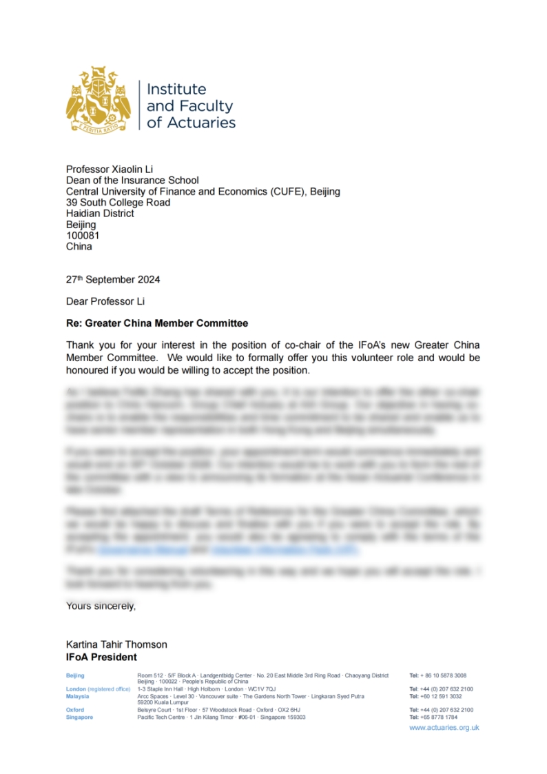 近日,英国精算师协会(IFOA)大中华区委员会成立,伟德官网李晓林教授出任该委员会联席主席。