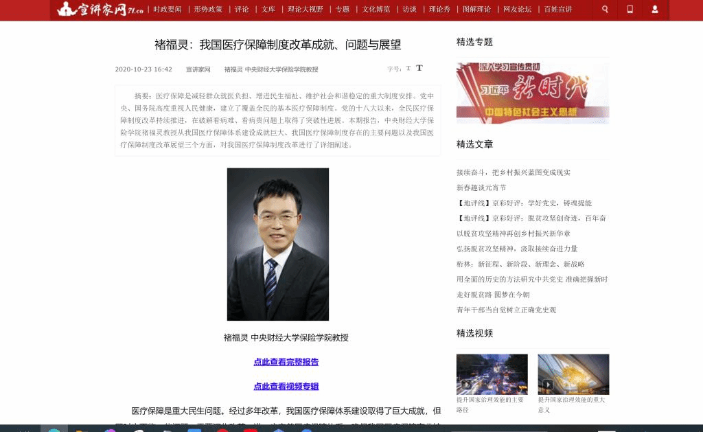 在服务社会建设方面,中心负责人褚福灵教授应邀在北京市委宣传部宣讲家网站(www.71.cn)发表民生保障方面的视频报告,宣讲国家社会保障方针政策。根据北京市委讲师团的安排,结合党的十九大、党的十八大精神,褚福灵教授发表了《织密织牢社会保障安全网——学习领会党的十九大精神》《深入推进新时代社会保障体系创新》《在发展中保障与改善民生》《我国医疗保障成就问题与展望》《加快推进基本养老保险全国统筹》《建立健全更加可持续的基本养老保险制度》等视频报告,其中《织密织牢社会保障安全网——学习领会党的十九大精神》作为优秀报告推介到中宣部。褚福灵教授还多次就民生保障问题接受中央权威媒体采访,解疑释惑,发引领之声。