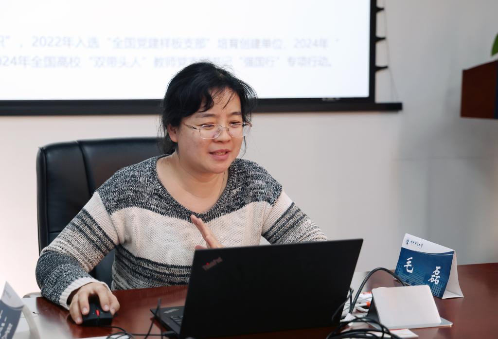 保险系教工党支部书记郑莉莉汇报了全国高校“双带头人”教师党支部书记“强国行”专项行动的建设情况。她从党支部基本情况、专项行动建设思路和专项行动计划建设举措三方面进行了汇报。她指出,党支部在习近平新时代中国特色社会主义思想和党的二十大精神的指导下,始终坚持“一融双高”,以服务国家战略、保险行业需求、人才培养和师生发展为宗旨,围绕立德树人根本任务,通过党建联建、大思政建设、教育服务、保险科技赋能和实践育人等多维度全面推进基层党组织工作,党支部在组织优势和资源共享方面的作用逐步凸显,未来将注重统筹推进党建和学科业务融合发展,确保党支部建设与保险学科发展双向促进、协同进步。