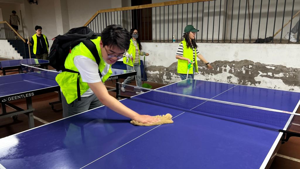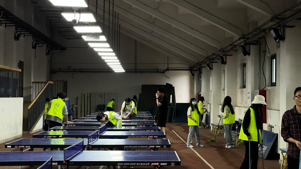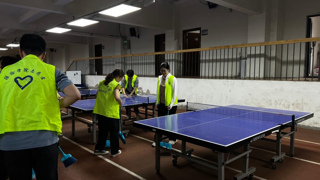 支部成员分工配合、积极投入,在场馆内擦拭乒乓球桌及其他设施、清扫地面、捡拾垃圾。经过半小时的辛勤劳动,场馆变得干净整洁,焕然一新。