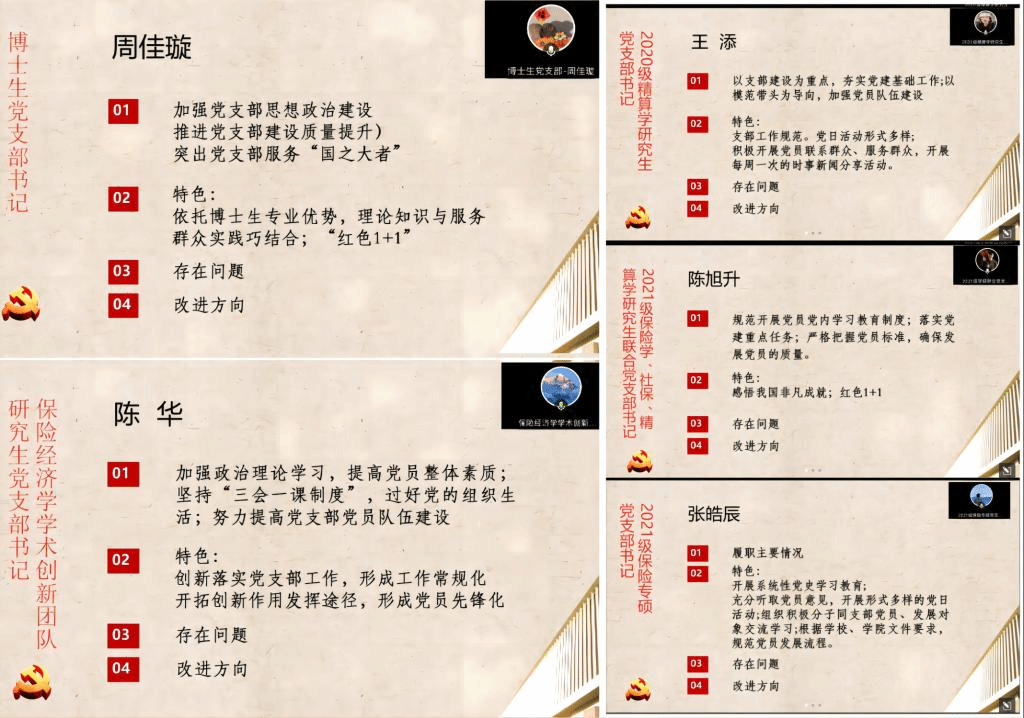 博士生党支部书记周佳璇表示,2022年支部延续以往合作优势,与恒大幸福家园第一社区党支部开展红色“1+1”支部共建活动,活动成果显著。保险经济学学术创新团队研究生党支部书记陈华汇报了主要工作,展示“党支部建在学术团队上”的特色,表示在以后的工作中,将继续把党建工作融入学院教学、科研、教师发展和学生培养,在完善组织、落实制度、提高工作能力上下工夫。2020级精算学研究生党支部书记王添表示在以后的工作中,将更多地安排实效性强的线下党日活动,提升支部活动的朝气,鼓励积极分子踊跃参与党日活动,努力向党组织靠拢。2021级保险学、社保、精算学研究生联合党支部书记陈旭升表示,支部始终坚持规范开展党员党内学习教育制度,针对支部对党员教育治理措施不足的问题,将进一步注重学习效果,激发党员学习热情和参与活动积极性。2021级保险专硕党支部书记张皓辰从支部建设情况、党员发展工作、支部活动开展情况三方面作履职情况汇报,全方位总结了2022年抓党建工作情况,他提到,作为毕业生党支部,将更多地组织支部线下活动,加强组织凝聚力。