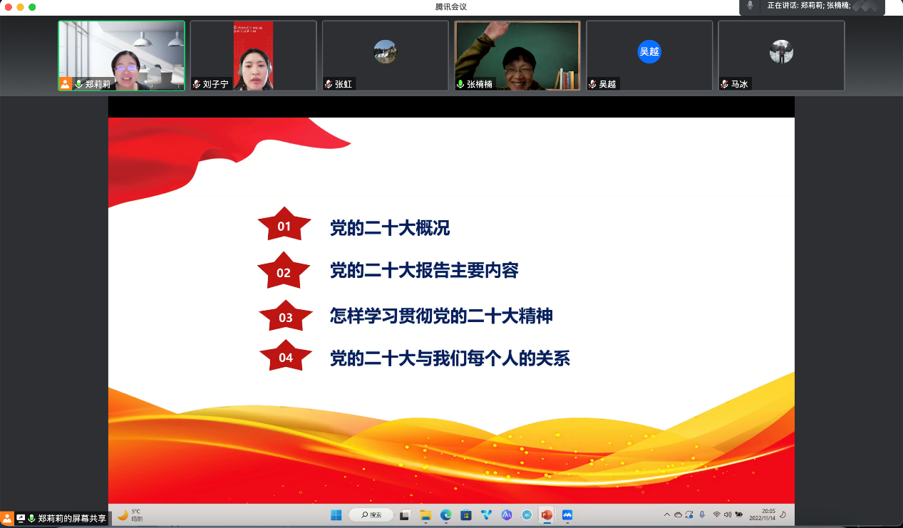 党的二十大高举旗帜、凝聚力量、团结奋进,为新时代新征程党和国家事业发展、实现第二个百年奋斗目标指明了前进方向、确立了行动指南。保险系教工党支部书记郑莉莉同志整理了党的二十大报告的相关内容,同支部全体党员一起深入学习了党的二十大精神。由于疫情原因,本次活动在线上举行。支部书记郑莉莉主持了会议,郑莉莉以《全面建设社会主义现代化国家的行动纲领——学习党的二十大报告体会》为题,分别讲解了党的二十大概况,党的二十大报告主要内容,怎样学习贯彻党的二十大精神以及党的二十大与我们每个人的关系等内容。