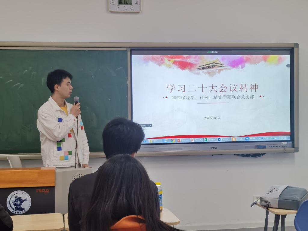 10月31日,伟德betvlctor体育官网2022保险学、社保、精算学硕联合党支部在沙河校区二教109召开学习党的二十大精神专题党课。作为刚成立的学生党支部,支部里的每一位成员深知自己作为党的青年力量,应该深刻学习会议精神,不断提高青年党员的党性修养。在支部书记张龄立的带领下,支部成员共同学习了党的二十大精神和党章,会议由宣传委员唐陈雪主持。