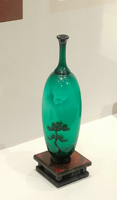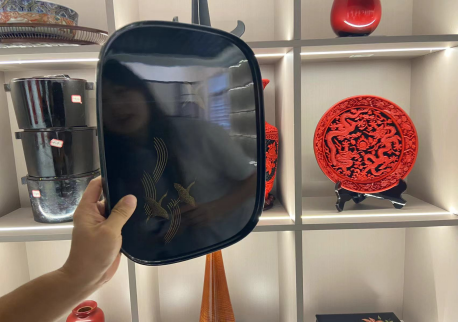 在前期文献查阅过程中,我们了解到早在清乾隆年间,以陕西省平利产地牛王沟而得名的“牛王漆”,以“漆液清如油,光亮照见头,搅动琥珀色,挑起如钓钩”为特点,被誉为“国漆”。2022年,平利牛王漆艺获批为陕西省非物质文化遗产保护项目。8月29日,我们赶赴平利县龙头村龙头国漆文化产业园进行考查,在工作人员何海林师傅的带领下,我们首先参观漆器博物馆内精美绝伦的漆器,何师傅向我们团队详细生动地介绍了漆艺品的制作过程。工艺精湛、绝美细腻的漆器艺术品让人眼花缭乱,在参观过程中栩栩如生的青绿山水漆画瓶与明亮平滑如镜的花纹镜底托盘给实践团队留下了极其深刻的印象,我们无不赞叹漆匠高超的手艺。面对漆艺品的造型和纹饰,大家也在思考将这些表现技法等融入到自己等专业表现之中。